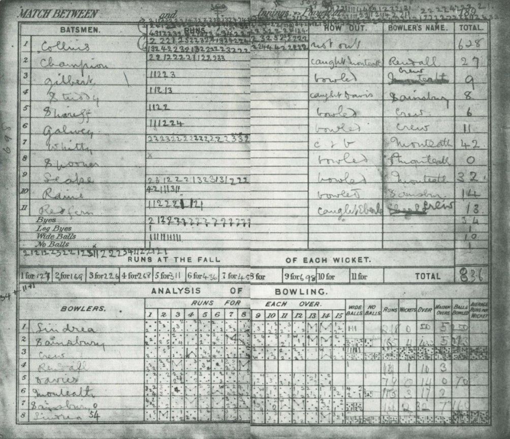 The previous record for the highest score was held by A.E. Stoddart – in 1886, he scored 485 in 370 minutes for Hampstead against Stoics, all after spending the entire night before the game playing poker. Stoddart later became England’s captain. After Collins’s feat, seven other scores of over 500, and one near miss, have been recorded: