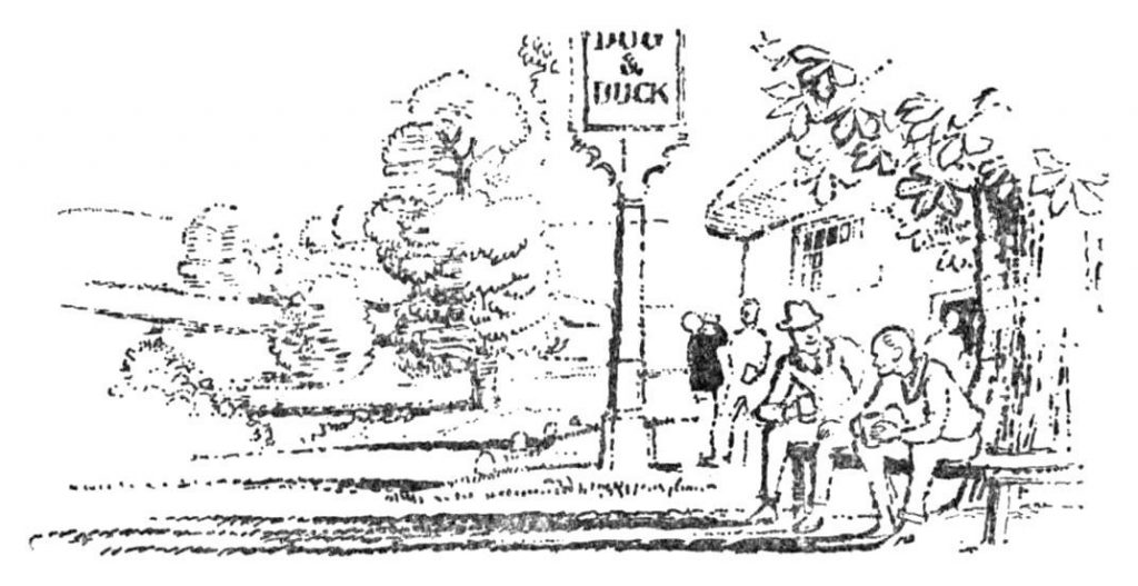 ‘Oh no! That’s all right; I’ll stay here,’ said Sid, protesting. But Ted Bannister took one arm and old John the other, and he was dragged into The Dog and Duck not, it must be owned, too reluctantly. A friendly but vigorous argument ensued between John and Ted Bannister as to who should stand treat, which was won by Ted Bannister, John grumbling that he never knew such a chap.